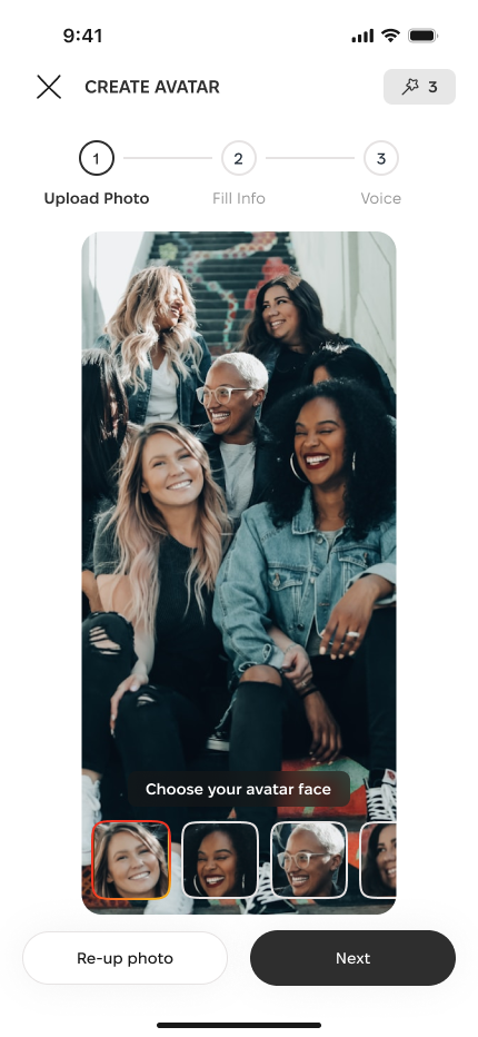 Seja mais criativo com seus avatares: agora você pode usar fotos de grupo. Basta escolher a pessoa principal, e nós criaremos seu avatar a partir daí. Quer uma foto mais simples? Use a personalização visual para remover quem não for necessário. Experimente e divirta-se criando!